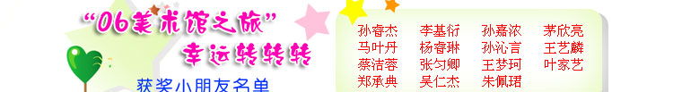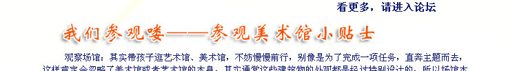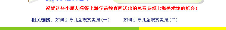 上海学前教育网的《03早教频道》之《涂鸦馆》栏目将不定期组织“美术馆之旅”活动,引领孩子们走进神圣的艺术殿堂;睁大眼睛,发现、感受美!接受美的陶冶!大胆表现、表达对美的感受!