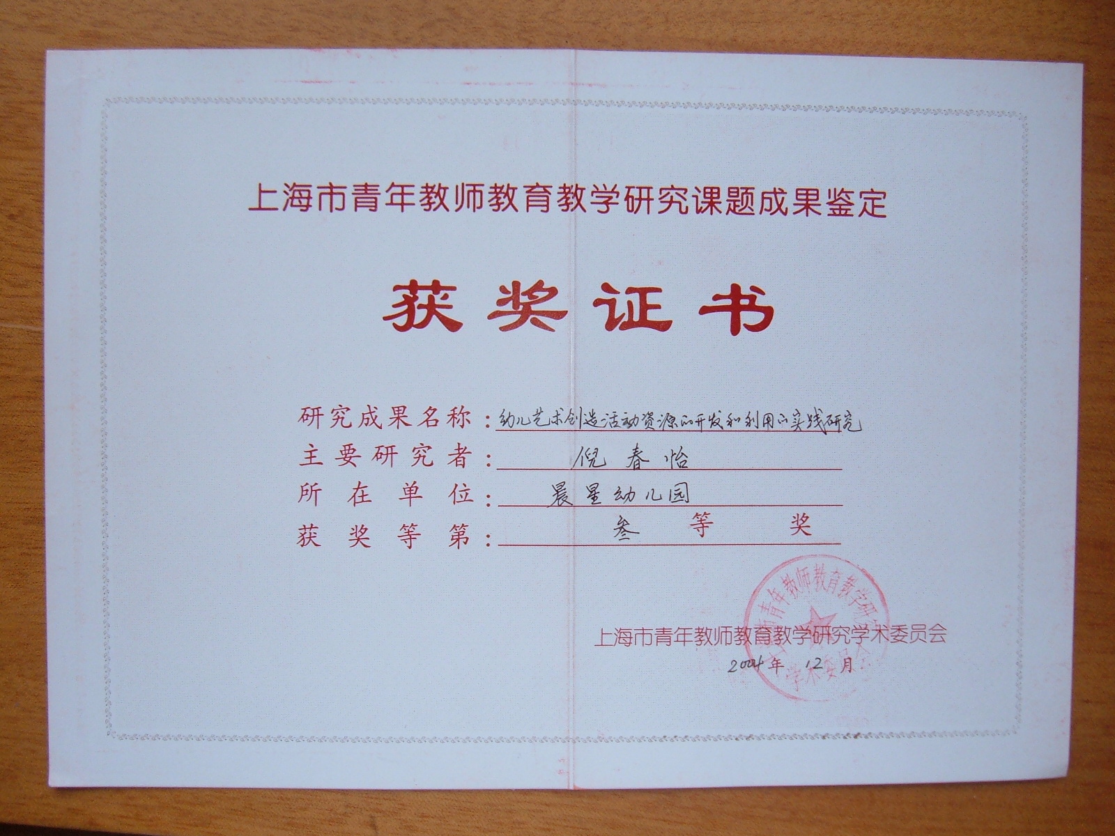 5、《在非正式活动中充分运用感受环节,提高幼儿创造表达的策略研究》获青浦区第十届教育科学研究论文成果三等奖2004、9