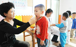 普陀幼儿园召开了以预防手足口病为主题的家长会,向家长宣传手足口病的相关知识及预防措施,取得了良好的效果。……[看全文] 松江张泽幼儿园成立以园长为组长的预防手足口病领导小组,通过贝贝广播、国旗下讲话等形式进行手足口病知识宣传教育。日常强调幼儿餐厅、食堂、室内外环境消毒工作,保健老师做到把好晨检关,班主任老师认真记录幼儿缺勤情况和原因……[看全文] 普陀长征中心幼儿园细化晨检工作,重点观察幼儿的口腔和手脚等部位,以便早发现,早隔离,早报告。及时调整每天消毒的时间和次数,加大消毒力度,做好日常用具、玩具、餐具、毛巾、桌椅、地面、厕所、床上用品等的清洗消毒……[看全文] 南汇坦直幼儿园:对幼儿加强个人卫生方面的教育,要求幼儿勤洗手、勤剪指甲;指导幼儿饭前、便后勤洗手,让幼儿养成良好的卫生习惯。……[看全文]