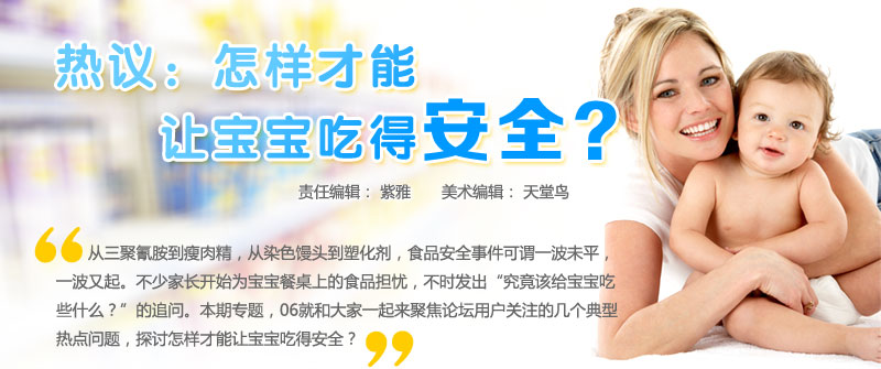 编后语: 关于宝宝“安全饮食”,爸爸妈妈们关心的话题其实还有很多,登录06论坛“家中孩子(0-6岁)的饮食有以下这些现象吗?”继续和我们一起探讨吧! 让宝宝安全饮食、健康成长是每一位爸爸妈妈的心愿,也是作为父母的职责。为此,06提倡: 爸爸妈妈们每周能花几个小时时间精心给宝宝挑选纯天然、健康、并且适宜自己宝宝的安全食品;亲自下厨烹饪食物,因为你才是最了解宝宝口味的厨师;如果宝宝能参与动手,亲子感情也会更胜一筹。 宝宝吃的安心、开心,爸爸妈妈才能真正放心!