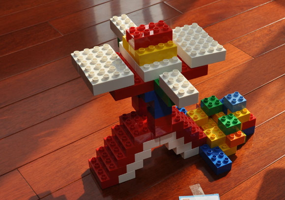 过了很久,他终于豁然开朗,动手拆塔。也许孩子脑子里装着一个烙印,但这一刻,他真正学会计划手中有限的资源,舍得打破并重新开始,这是多重要的一步!搭好“艾菲尔铁塔”后他又用余下的积木搭了一架飞机,想象着飞在塔的上空。
