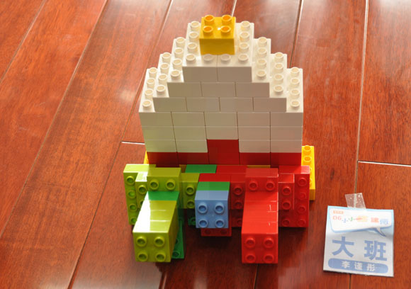 老师说:“他在搭的过程中对比真实物的造型做了改造,虽然不符合实物,但反映了孩子的创意。这个孩子的搭建能力很强,他能清晰地记住物体的特征;色彩、造型对称;而如果大家留意看会发现炮口和炮身呈现一个斜角,这有相当的难度,为此,孩子聪明地设计了一个底座;此外,上小下大的造型保证了结构稳定。”