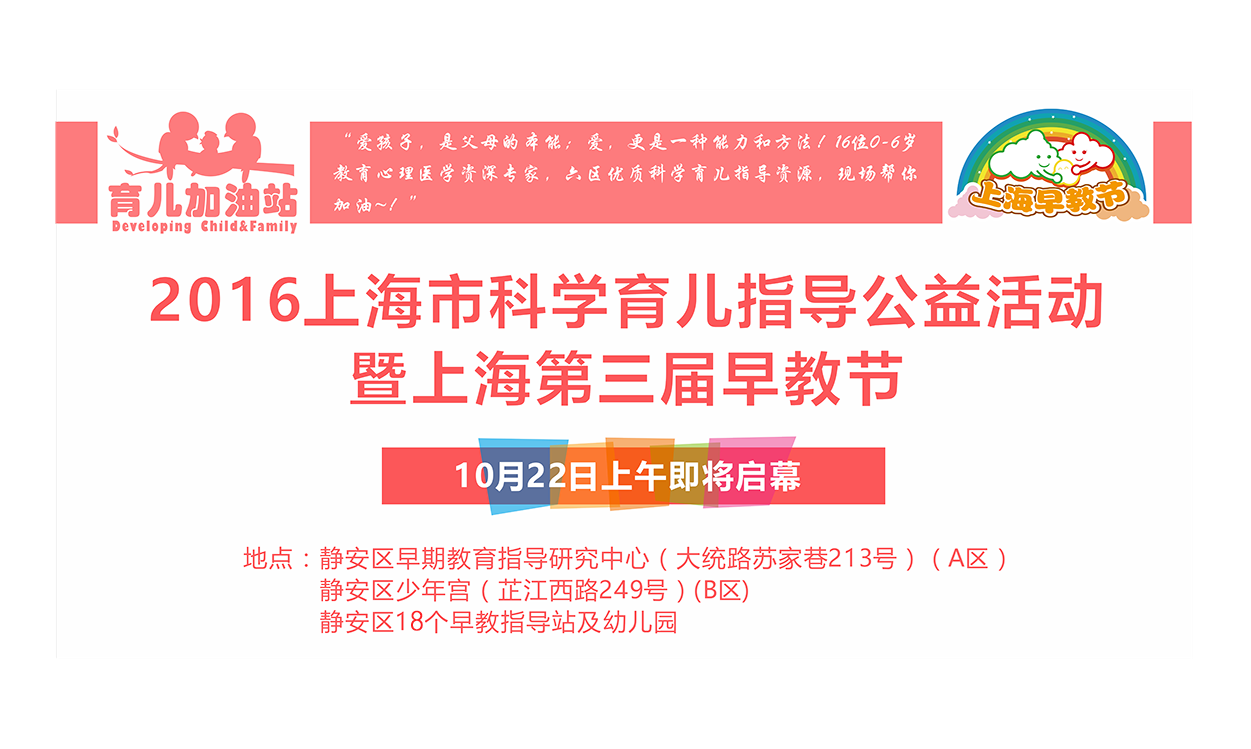 2016上海科学育儿指导静安分会场活动暨“亲亲宝贝”上海第三届早教节由静安区教育局联手上海市科学育儿指导项目组,在上海市教育委员会与静安区人民政府的大力指导下,联合黄浦区、长宁区、普陀区、虹口区、杨浦区的优质科学育儿指导专业资源,为沪上一千余户家庭提供专业科学育儿指导公益服务。活动精彩丰富,亮点看不停!
