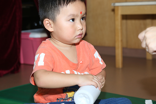 家长把所有铃铛装在瓶子里盖起来,观察宝宝会不会摇瓶子“制造”声音,观察宝宝拿瓶子的哪个部位?以此来观察孩子精细动作的情况。