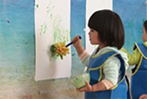 以生活中常见的涂刷工具(牙刷、奶瓶海绵刷、刷子等)为游戏材料,利用鲜艳的色彩,激发宝宝涂鸦,发展手眼协调能力。