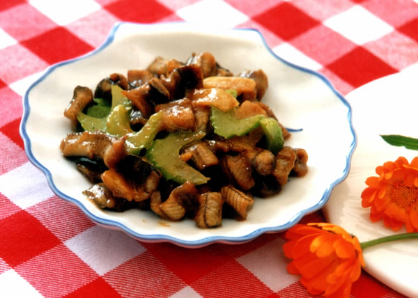 制作要点: (1)将黄鳝去头、去骨改刀成鳝背片待用。苦瓜去籽改刀成片状,用开水焯一下取出待用。 (2)洗净炒锅放置炉上烧热,加入油烧热,加萄段、姜片煸出香味后,放入鳝背煸炒至肉色发白后加入黄酒、酱油、盐、白糖及少许汤水,待其烧开后略为烧煮一会儿,放入苦瓜片,大火烧开加味精后用水淀粉勾芡,翻炒后淋少许麻油后即可装盆。 营养价值:苦瓜清热解毒,黄鳝营养丰富。 特点:口味独特,色泽褐中透绿。。